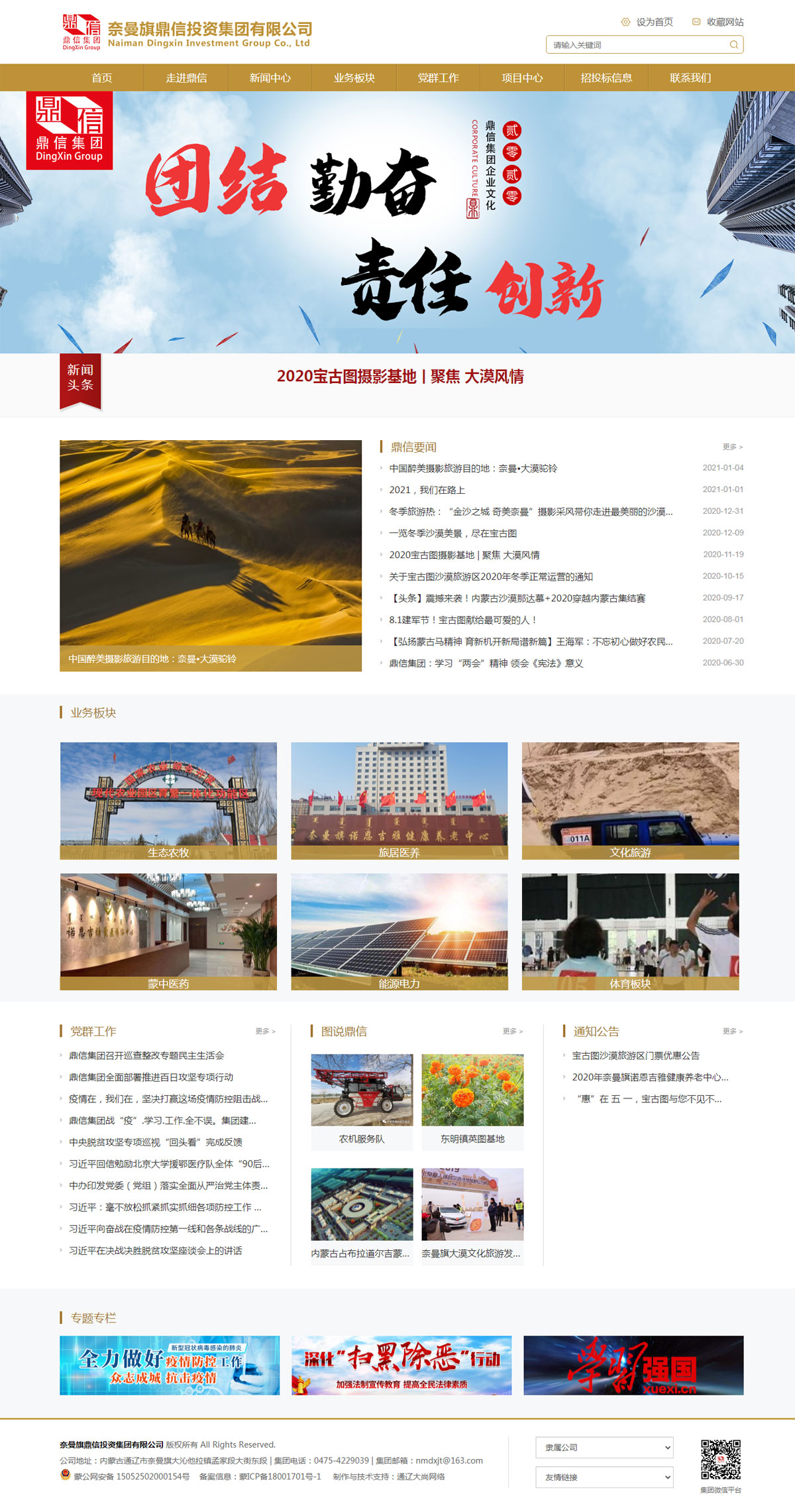 鼎信集團(tuán)在旗委旗政府的堅(jiān)強(qiáng)領(lǐng)導(dǎo)下,將以堅(jiān)定實(shí)業(yè)興企的戰(zhàn)略,以抓實(shí)重大工程建設(shè)項(xiàng)目為主要任務(wù),以推進(jìn)鼎信集團(tuán)轉(zhuǎn)型升級(jí)為主抓方向,以深化企業(yè)內(nèi)部改革為重要抓手,以強(qiáng)化企業(yè)黨建和文化建設(shè)為根本保障,以建設(shè)、經(jīng)營(yíng)、服務(wù)社會(huì)為職能,以戰(zhàn)略轉(zhuǎn)型和管理提升為主線,整合各領(lǐng)域的上下游資源,推動(dòng)關(guān)聯(lián)產(chǎn)業(yè)“三位一體”融合發(fā)展,將現(xiàn)代農(nóng)業(yè)、沙漠旅游、旅居康養(yǎng)等產(chǎn)業(yè)深度融合。同時(shí),抓住蒙中藥材、光伏發(fā)電、大數(shù)據(jù)等現(xiàn)代新興產(chǎn)業(yè)發(fā)展契機(jī),走穩(wěn)健經(jīng)營(yíng)、多元發(fā)展之路,實(shí)現(xiàn)經(jīng)濟(jì)效益、生態(tài)效益、社會(huì)效益多贏。